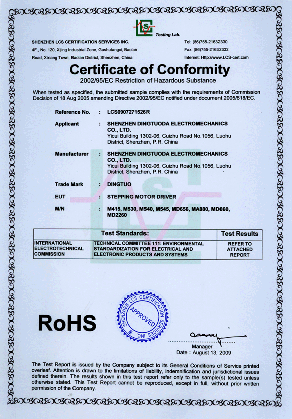 首页->产品认证->步进驱动器RoHS认证证书